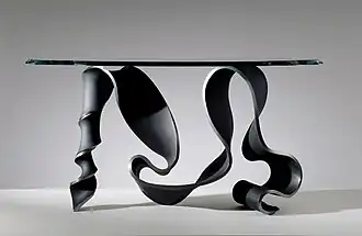 The late 1980s saw Lane shift into large-scale metal work. Lane developed methods of heating steel, making it possible to bend metal freely into what he calls "steel drawings," which are produced to function much like industrial-scale automatic drawings. An example of this work is Saddle (2006), in which a twisted metallic ribbon supports a glass tabletop.[8]