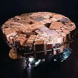 Another work from this period is Angaraib (1987), which takes its name from the traditional Sudanese rope-bed, united with the concept of the North American Indian 'horse travois'. The work is constructed from the branches of a storm damaged London plane tree, bound together with hemp rope, on top of which sits a raft of glass.[12][8]