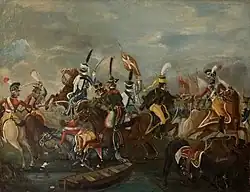 When the armistice ended on 5 January 1814, a Russian Cossack army, made of about four regiments (2,000 men), led by Friedrich Karl von Tettenborn, moved up through the Ejder up to City of Schleswig on the 5-6 January, then moving to Flensburg on the 6th, Aabenraa on the 7th and Haderslev on the 8th. They were followed by Swedish cavalry.[24] The Coalition army was so overwhelming that the local population in Schleswig and Holstein barely tried to resist the occupation.[25] Swedish troops moved up through Schleswig-Holstein into the Danish Wahld while Russian troops (also known as Cossacks) stayed and occupied Holstein.[23]