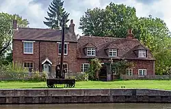 Dapdune Wharf comprises a complex of a dozen buildings. Most are concerned with the construction and maintenance of the barges and stores for the various materials needed. They include a smithy, a barge repair shed at the end of a short cut from the bend in the river, a carpenters shed, formerly the sail loft, and the barge building shed at the north end of the site. There was also a graving dock with associated capstans for barges needing repairs below the water line. There were separate stores for gunpowder, part of the oldest building on the site, and for carbide, which was delivered from London for fuel for lamps. Two specialist buildings were the steam chest for bending wood to shape for boat ribs, and the tar chest for caulking.[3] A cottage on the wharf, renovated in 1894 for the Edwards family, is a Grade II listed building.[4] The other cottage, Dapdune Lea, was built at the same time for William Stevens III's sister, Mary Jane Stevens. Later their brother, John, added a first floor balcony in order to be able to watch the cricket in comfort. Dapdune Lea is now the National Trust's administrative offices for the navigations.[3]