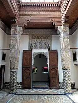 The palace covers a relatively large area at the northern edge of el-Hedim Square in the old city. It is designed according to traditional Moroccan architecture, decorated with sculpted and painted wood, carved stucco, and colourful zellij mosaic tilework. In addition to various rooms on multiple floors, it contains a large courtyard garden (riad) with orange trees and a menzeh (observation pavilion or platform).[1][5][2][4] The palace also had other facilities including kitchens, a mosque, and a small hammam (bathhouse).[1][4] An old upstairs reception room or salon with rich decoration and a wooden cupola ceiling has also been outfitted with traditional upper-class furnishings and is considered one of the highlights of the museum.[2][5][1] Outside the palace is a large street fountain (mentioned above), covered in elaborate zellij, which is adjoined to the exterior of wall of the palace and faces Place el-Hedim. The current entrance, next to this fountain, was created recently and replaces the original entrance which was off a nearby street.[4]