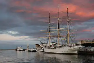 During the following years, rebuilt and converted into training unit fitted i/a with an auxiliary Diesel engine, she was used as a training ship, receiving the nickname "White Frigate". In 1934-1935 she travelled around the world (via Panama Canal). During that famous voyage, she called at many ports as the first ship ever under Polish flag. In 1937 a special voyage took her around the famous Cape Horn; thus she became the first ship under Polish Colours to round the famous cape. In 1938 she took part at the famous meeting of Baltic sail training ships at Stockholm, regarded as the predecessor of all the post-war Operation Sail meetings, winning i. a. special respect the skipper of Norwegian sail training vessel Christian Radich. During World War II she was interned in Stockholm. After the war, she was brought to Communist Poland and used as a training ship again.