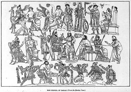 The Darius vase may have represented a scene from a Greek drama.[3] The depiction of Darius on his name-vase is possibly derived in its details from the Persae of Phrynikos, C. Anti concluded in 1952, and Schmidt 1960 follows him. However Oliver Taplin notes in Pots and Plays, 2007, p. 235-7, the only strong indications of tragic reference are Darius himself and the old man in paidagogos outfit on the plinth inscribed ΠΕΡΣΑΙ, who might be performing the messenger role. Taplin speculates that the iconography of tragedy "could be assimilated into other contexts without danger of confusion", op. cit. p. 237.