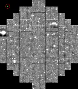 In March 2015, two teams released their discoveries of several new potential dwarf galaxy candidates found in Year 1 DES data.[43] In August 2015, the Dark Energy Survey team announced the discovery of eight additional candidates in Year 2 DES data.[44] Later on, Dark Energy Survey team found more dwarf galaxies. With more Dwarf Galaxy results, the team was able to take a deep look about more properties of the detected Dwarf Galaxy such as the chemical abundance,[45] the structure of stellar population,[46] and Stellar Kinematics and Metallicities.[47] In Feb 2019, the team also discovered a sixth star cluster in the Fornax Dwarf Spheroidal Galaxy[48] and a tidally Disrupted Ultra-Faint Dwarf Galaxy.[49]