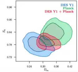 - ^ DES and SPT Collaborations; Abbott, T. M. C.; Aguena, M.; Alarcon, A.; Alves, O.; Amon, A.; Andrade-Oliveira, F.; Annis, J.; Ansarinejad, B.; Avila, S.; Bacon, D.; Baxter, E. J.; Bechtol, K.; Becker, M. R.; Benson, B. A. (2023-01-31). "Joint analysis of Dark Energy Survey Year 3 data and CMB lensing from SPT and Planck. III. Combined cosmological constraints". Physical Review D. 107 (2): 023531. arXiv:2206.10824. Bibcode:2023PhRvD.107b3531A. doi:10.1103/PhysRevD.107.023531. hdl:10261/336780. S2CID 249926390.