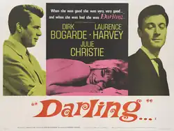 Darling is a 1965 British drama film directed by John Schlesinger from a screenplay written by Frederic Raphael.[5] It stars Julie Christie as Diana Scott, a young successful model and actress in Swinging London, toying with the affections of two older men, played by Dirk Bogarde and Laurence Harvey. The film was shot on location in London, Paris and Rome and at Shepperton Studios by cinematographer Kenneth Higgins, with a musical score composed by Sir John Dankworth.
