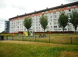 Over three phases a total of 1,336 deck-access apartments, in blocks ranging in height from between two and seven stories and with inter-linking pedestrian access corridors, were built.[7][5] This fell short of the initial number planned owing to a combination of economic, political and management setbacks. It was intended that Darnley would be a largely self-supporting estate and for this reason, two primary schools and a community centre formed part of the council's plans. A social club and bowling green, a church, a small shopping centre and a library were all added throughout the 1970s.[6] Most of the original 1970s deck-access housing, which by the late 1990s had become dilapidated and increasingly abandoned, was demolished and replaced by a smaller quantity of modest individual houses with the remaining blocks refurbished. The present housing stock is managed by Glen Oaks Housing Association which was founded in 1991 and later expanded its scope to include regeneration projects in nearby Arden and Pollok as well as more recent developments at Southpark and Regents Park (north of Carnwadric).[8]