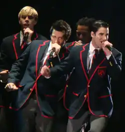 Blaine initially served as a friend and mentor for Kurt, the bullied gay member of the Warblers' rival glee club, New Directions. Chemistry between the two characters, combined with fan support for the potential couple, led series co-creator Ryan Murphy to pair them romantically onscreen. At the beginning of the third season, Blaine transfers to McKinley High and joins New Directions; concurrently, Criss was promoted from recurring guest star to the show's main cast.[52] In the subsequent seasons, Blaine goes off to college and later returns to Dalton to become the vocal director of the Warblers. From May 21 – July 3, 2011, Criss and the cast of Glee performed in Glee Live! In Concert!, touring the US, Canada, England, and Ireland. According to Billboard, it was the 16th most successful concert tour of 2011, grossing more than $40 million, with total attendance topping 485,000. All 40 dates sold out, including shows at Staples Center, Nassau Coliseum, and The O2 Arenas in London and Dublin.[53][54]