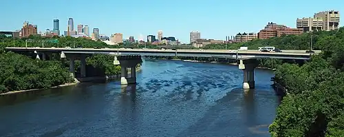 The Dartmouth Bridge is a steel girder bridge that spans the Mississippi River in Minneapolis between the Cedar-Riverside area and the University of Minnesota campus area. It carries I-94/US 12/US 52. It was built in 1964 and was designed by Parsons Brinckerhoff, Quade and Douglas. It is named for its proximity to Dartmouth Avenue SE, just north of the bridge.