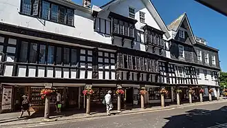 - ^ The Butterwalk originally had a further house at its eastern end, fronted by two more pillars on the ground-floor arcade, but this was not reconstructed in the post-war restoration.[4]