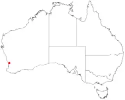 Muchea bell is found in a small area on the Swan Coastal Plain,[4] with three locations recorded around Muchea about 70 kilometres (43 mi) north of Perth, Western Australia occupying a total area of about 1.2 square kilometres (0.5 sq mi). It grows on sandy grey-black mounds where there are seasonally moist winters to wet clay situations in either tall or low scrubland and areas where water collects.[3][4]