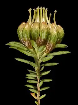 Darwinia hortiorum is an erect to spreading, densely branched shrub with a compact habit. It typically grows to a height of 0.8 metres (2.6 ft) and a width of 0.8 m (2.6 ft). The glabrous plant is single-stemmed at the base with spreading main branches bearing many ascending, leafy branchlets with pale stems. Older stems have a covering of reddish-brown, papery bark that peels off in flakes. The leaves are arranged alternately, widely spaced, narrow egg-shaped to almost linear, 3–6 mm (0.1–0.2 in) long and 1–2 mm (0.04–0.08 in) wide. The inflorescences appear at the ends of the branches and are composed of groups of 14 to 22 flowers. Each flower has five smooth, glossy, yellowish petals tinged with crimson, five warty dark green sepals with prominent oil glands and two papery brown bracteoles. Ten stamens protrude between the petals and the style is curved towards the centre of the inflorescence. Flowering occurs between late September and early December. The plant is distinctive with no obvious close relatives, although it superficially resembles Darwinia thymoides which is found in the same habitat.[2][3]