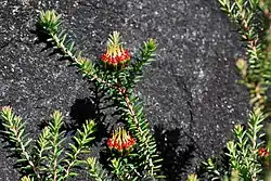 This shrub is found in a small area near Wandering in the South West region of Western Australia.[3] It is distributed throughout five localities in the Jarrah Forest biogeographic region, occupying an area of approximately 9 square kilometres (3 sq mi) in the Monadnocks Conservation Park and neighbouring Boonering State Forest. All known populations are found amongst granite outcrops and their drainage lines growing in shallow granitic clay loam soil with broken rock. Associated species include Allocasuarina humilis, Andersonia species, Grevillea bipinnatifida, Grevillea manglesii, Banksia recurvistylis, Hakea undulata, Hakea trifurcata, Verticordia insignis, Calytrix depressa, Xanthorrhoea preissii and Hibbertia hypericoides.[2]