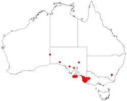 Small darwinia grows in swales and near salt lakes in south-eastern South Australia and in the Little Desert area of western Victoria.[2][3][4]