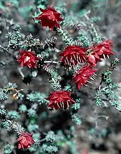 Darwinia purpurea, commonly known as the rose darwinia,[2] is a species of flowering plant in the family Myrtaceae and is endemic to the southwest of Western Australia. It is a spreading shrub with linear leaves and dense heads of red or yellow flowers surrounded by many overlapping involucral bracts.