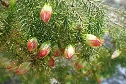 Darwinia wittwerorum, commonly known as Wittwer's mountain bell,[2] is a plant in the myrtle family Myrtaceae and is endemic to a small area in Western Australia. An erect, spindly shrub with fine leaves and hanging groups of flowers surrounded by leaf-like bracts, it is one of the darwinias known as mountain bells.