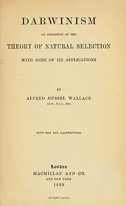 Darwinism: An Exposition of the Theory of Natural Selection with Some of Its Applications is an 1889 book on evolution by Alfred Russel Wallace, the co-discoverer of evolution by natural selection together with Charles Darwin. This was a book Wallace wrote as a defensive response to the scientific critics of natural selection.[1] Of all Wallace's books, it is cited by scholarly publications the most.[2]