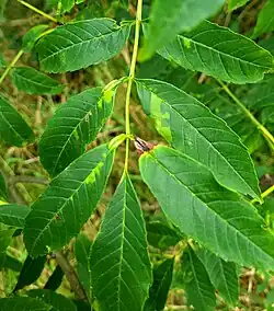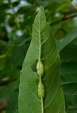 Most of the gall is on the underside of the main vein, where it forms a narrow green pouch. There can be several on a leaf, ranging in size from 5 mm to 30 mm, although they can coalesce. Each contains an orange larva. There is a slit-like opening on the upperside of the leaf. The galls can be found from June to October and can also be found on the petiole and rachis.[1][2] It is found on Fraxinus angustifolia & subsp., F. excelsior, F. ornus and F. oxycarpa.[3]