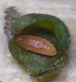 | Pupa (top) and galls caused by Dasineura gleditchiae on the foliage of honey locust (bottom) | |