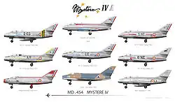 - In addition to production Mystère IVA, Dassault developed an upgraded Mystère IVB with either Rolls-Royce Avon (first two prototypes) or SNECMA Atar 101 (third prototype) afterburning engine and a radar ranging gunsight. Six pre-production aircraft were built but the project was abandoned in favour of the promising Super Mystère. In 1954, French pilot Constantin Rozanoff was killed while doing a low-level flyover of this aircraft.