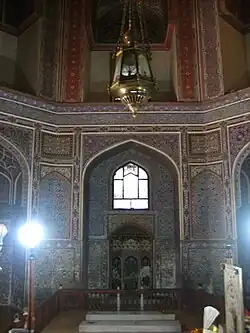 His mausoleum in Shergarh, Punjab, was completed in 1580 CE. The interior of the octagonal shrine is decorated with intricate floral and geometric frescoes. On each of the eight interior lower alcoves are Persian couplets by Shah Abul Muali extolling Daud. The grave is in an enclosure in the center of the shrine with the graves of six of his lineal descendants on either side. The exterior of the shrine has panels of intricate stucco tracery on all sides. The shrine, is under the care of the Auqaf Department and the Archeology Department of the Government of Punjab, Pakistan, which conducted extensive restoration work in the 1980s, mainly on the preservation of the frescoes.[2][3]