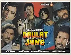 Daulat Ki Jung : War of Wealth is a 1992 Hindi-language action adventure romance film starring Aamir Khan, Juhi Chawla in lead roles, along with Paresh Rawal, Dalip Tahil, Kiran Kumar, Kader Khan in supporting roles. The film was a box office failure.[1][2]