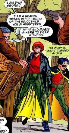 Dava Sbörsc's homeland of Tbliska was left in ruins by a long and bloody civil war, with the country being divided into the two countries Krasna-Volny and Transbelvia, neither of which acknowledges its neighbor as a true country. Both sides committed numerous atrocities in the war, which left thousands dead. When very young, Dava joined the Transbelvian army and pledged herself to hunting down and killing the worst killers in the Krasna-Volnian army. Being fast but small, Dava realized she would have to end any combat quickly if she was to win. To that end, she committed herself to learning all "single-blow techniques" - martial arts attacks that can defeat a foe with a single attack. She had mastered almost all known single-blow attacks (including "The Scalpel", "The Wind Through the Reeds", "The Lion's Paw", "Wave and Shore" and "The Skullcrack") when she sought out The Master of the Iron Hand, to learn his technique "The Whispering Hand". While learning from the Iron Master, she encountered Tim Drake (Robin), who was also studying with the Master at the time. She greatly impressed Robin, defeating him in a sparring match with astonishing speed. Robin, in turn, impressed her when he skillfully dispatched a thief seeking to take the dojo's texts. Dava confided in Robin that she also intended to seek out Lady Shiva to learn the Leopard Blow technique. Tim was greatly troubled by this, as he had met Shiva in the past and knew what a ruthless killer she was.