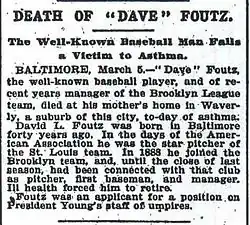 - ^ "Death of "Dave" Foutz – The Well-Known Baseball Man Falls a Victim to Asthma". New York Times. March 5, 1897. p. 2. Retrieved March 9, 2018.