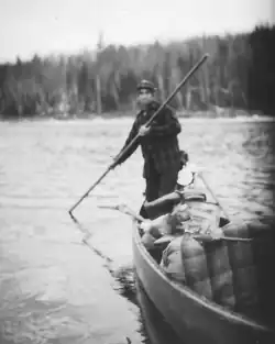 In 1929 Dave Jackson was employed as a Maine game warden assigned to live and work out of a small 255-square-foot (24-square-meter) cabin on Umsaskis Lake on the upper Allagash River.[3] The cabin was one-quarter mile (400 meters) from the unpaved Lacroix road from Lac-Frontière, Quebec and could be reached only on snowshoes for most of the winter.[6] His patrol area consisted of twenty townships with a combined population of about 3000 living mostly in 50 scattered logging camps. Patrols lasting up to ten-days were made on snowshoes through the winter months and by canoe or on foot during the summer.[7] The area had been logged in the early 19th century, and Édouard Lacroix began cutting second-growth hardwood and pulpwood in 1926.[8] Many of the men working in the logging camps were French Canadians unfamiliar with Maine laws, unable to read English, and accustomed to animal trapping and hunting for food.[9] Warden Jackson narrowly avoided being hanged by an illegal snare set for deer.[10] When he arrested poachers, they often had to snowshoe more than 60 miles (100 km) to court.[11]