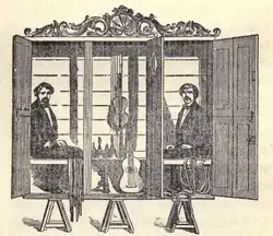 The Davenports were exposed in September, 1865 in Paris after one of the committee men noticed the ropes on the floor were not the originals.[3] A spectator rushed the stage, "put his hand on the bench round which the cords are wound, touches a spring, the bench bends in the middle, and the cords fall at the feet of the captives". The crowd were angry and highjacked the stage but the French Gendarmerie were able to restore order after promising a refund. During the riot the Davenports escaped the theatre.[3]