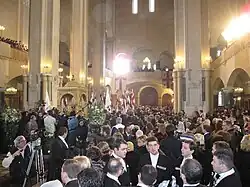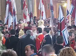 Prince David Bagration of Mukhrani married Princess Ana Bagration-Gruzinsky on 8 February 2009 at the Tbilisi Sameba Cathedral.[4] This marriage had come to fruition with the support and blessing by the pro-monarchist Catholicos Patriarch of the Georgian Orthodox Church, Ilia II, and was officiated by two Bishops Metropolitan, Theodore and Gerasimos. This marriage united the two branches of the Georgian former royal family with competing claims to the rights to the throne of Georgia – those of Gruzinsky and of Mukhrani – and drew a crowd of 3,000 spectators, officials, and foreign diplomats, as well as extensive coverage by the Georgian media.[1][4]