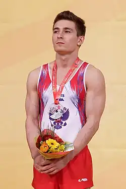 David Sagitovich Belyavskiy (Russian: Давид Сагитович Белявский, IPA: [dɐˈvʲid bʲɪˈlʲafskʲɪɪ̯]; born 23 February 1992)[1] is a Russian artistic gymnast and three-time Olympian, representing Russia in 2012 and 2016 and ROC in 2020. He was part of the teams who won gold at the 2020 Olympic Games and 2019 World Championships and silver at the 2016 Olympic Games and 2018 World Championships. Individually Belyavskiy won an Olympic bronze medal on parallel bars in 2016 and a World silver and bronze medal on pommel horse and parallel bars, respectively, in 2017. Additionally he is the 2019 European Games champion, a five-time European Games medalist, seven-time European champion, and 18-time European medalist.