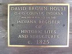 The David Brown House (constructed circa 1825) is located 4 miles (6.4 km) north of Rising Sun, Indiana and approximately 3 miles (4.8 km) south of Laughery Creek. The log home was placed on the Indiana Register of Historic Sites and Structures on October 25, 1978.