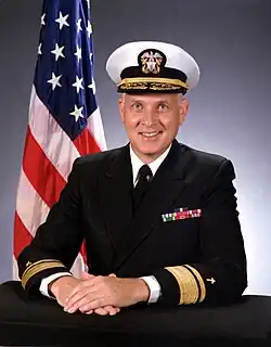 David Edward White (born November 26, 1938)[1] is a retired rear admiral in the United States Navy. He was Chief of Chaplains of the United States Navy from August 1991 to August 1994.[2] He earned an A.B. degree from Hope College in 1960 and an M.Div. degree from the New Brunswick Theological Seminary in 1963. White was commissioned as an ensign on March 5, 1962, and promoted to lieutenant (junior grade) after completing his training as a Reformed Church in America minister. He later received an M.S. degree from the Naval Postgraduate School in 1973.[1]