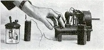 In 1878 Hughes published his work on the effects of sound on the powered electronic sound pickups, called "transmitters", being developed for telephones.[6] He showed that the change in resistance in carbon telephone transmitters was a result of the interaction between carbon parts instead of the commonly held theory that it was from the compression of the carbon itself.[7] Based on its ability to pick up extremely weak sounds, Hughes referred to it as a "microphone effect" (using a word coined by Charles Wheatstone in 1827 for a mechanical sound amplifier[8]). He conducted a simple demonstration of this principle of loose contact by laying an iron nail across two other nails connected to a battery and galvanometer. His paper was read before the Royal Society of London by Thomas Henry Huxley on May 8, 1878, and his new "microphone" was covered in the July 1 edition of Telegraph Journal and Electrical Review. Hughes published his work during the time that Thomas Edison was working on a carbon telephone transmitter and Emile Berliner was working on a loose-contact transmitter.[9] Both Hughes and Edison may have based their work on Philipp Reis' telephone work.[9] Hughes would refine his microphone design using a series of "carbon pencils" stuck into blocks of carbon to better pick up sound but never patented his work, thinking it should be publicly available for development by others.