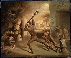Blythe painted Lincoln Crushing the Dragon of Rebellion in 1862. The work depicts a fiery Abraham Lincoln in the center of the canvas, straining forward (with one ankle shackled) to crush rebellion (depicted as a reptilian dragon) while in the background, a huge fire rages.
