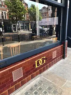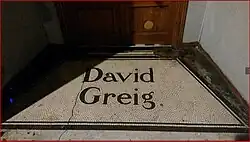 A commemorative plaque has been placed on 32 Hornsey High Street, the site of the very first Greig shop.[24] The David Greig shop at 54-58 Atlantic Road, Brixton, is no longer a supermarket, but the frontage, containing a "DG" cypher, remains relatively original, and although the full name has been removed from the facade it is still visible in the mosaic floor outside the recessed shop entrance.[25][26] Two well-preserved examples of David Greig shops have been listed Grade II by Historic England - firstly in 2000 the branch at 177 Streatham High Road (for listing description see: https://historicengland.org.uk/listing/the-list/list-entry/1380345?section=official-listing) and later in 2017, No.65 Lordship Lane in East Dulwich both largely retain their authentic late 19th-century interiors.[27]