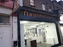 The David Greig chain is considered to have been established in 1870, when the wife of a Hornsey cabinet maker of Scots birth, Mary Greig opened a small provisions shop at 32 High Street, Hornsey.[2][3][4] By 1881 her son David Greig had joined her in the business and described himself as a 'provision dealer' in the census of that year.[2] The business thrived and wishing to expand beyond Hornsey, Greig opened his first shop at 54-58 Atlantic Road, Brixton in 1888,[2] which he and his wife, Hannah Susan Deacock lived above.[5] Around 1890 a second shop was opened at nearby Loughborough Junction, near Brixton. This was probably the shop at 232 Coldharbour Lane where a wooden 'David Greig' fascia with 'Brilliant cut' gilded lettering in the distinctive serif typeface of the chain, was uncovered in 2020.[6] In 1895, David Greig was accused of selling margarine as butter.[7]