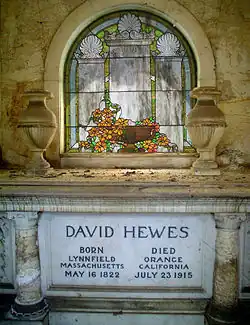 Hewes became very interested in his family genealogy, especially his ancestor Lt. Joshua Hewes who had emigrated from England to the Massachusetts Bay colony in 1633.[5] He commissioned Eben Putnam, a California genealogist, to collect and edit material for a Hewes family genealogy.[5] This volume, privately published in 1913, includes a biography of David Hewes (pp. 191-205), an autobiography (pp. 225-264), an appendix with a transcription of the memorial booklet for Anna Lathrop Hewes, and an appendix with letters from his mother, and many photographs and paintings of Hewes and his family members, his house in Tustin, and advertisements and labels for the fruit produced by his ranch.[5]