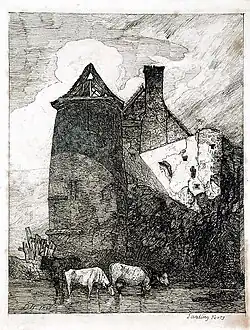 Hodgson's reputation rests upon his ability as a painter of oils, but not for his etchings.[36] These were influenced to an extent by John Sell Cotman,[16] and were also possibly influenced by George Cuitt (1774-1854), according to the historians Andrew Moore and Russell Searle.[36] The etchings of Henry Ninham are finer in quality,[51] and whilst Hodgson was technically accomplished, he lacked Cotman's skills and draughtsmanship.[36] In Searle's opinion, his outstanding plate is Sandlings Ferry from Antiquarian Remains Principally confined to Norwich and Norfolk, an etching that strikes him as "brooding" and being unlike that of any other by an artist of the Norwich School.[52]