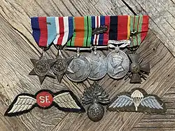 Throughout his military career, he was awarded the Croix de Guerre with silver gilt star, the 1939–1945 Star, the France and Germany Star, the Defence Medal, the War Medal 1939–1945 with an Oak Leaf, the Efficiency Medal (HAC), and was mentioned in despatches (MiD).[6] Among his personal effects, he also kept his SF Wings, his Parachutist Badge, and his Royal Fusiliers Cap Badge.