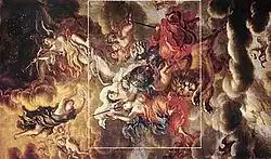 Ehrenstrahl also painted several ceilings and large wall pieces with allegoric motifs. The great hall ceiling fresco, named The Great Deeds of The Swedish Kings, in the Swedish House of Knights (Riddarhuspalatset) made between 1670 and 1675, is considered to be his greatest work. A second version was made during 1695 on the ceiling of Ehrenstrahlsalongen (the Ehrenstrahl parlour) at Drottningholm Palace, the home of the Swedish royal family.[5] The center piece of the Drottningholm fresco also became the motive of the 1000th postage stamp designed by Polish postage stamp and banknote engraver Czesław Słania (1921-2005). The stamp was issued by the PostNord Sverige in March 2000.[6][7] [8]