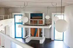 While restoring and studying the architecture of grand pianos, Klavins became a critic of the traditional way to construct these instruments.[1] He stated that the materials used in common piano making are outdated and don't reflect the current status of materials science. With this in mind, Klavins designed a piano with a size, shape and interior construction based on modern knowledge of acoustics – rather than the historical construction guidelines used in traditional piano making. In November 1987, he presented the "Klavins Klavier Modell 370" to the public in the German city of Bonn. It had its name from its height: 370 centimetres. In contrast to horizontally built grand pianos, the Modell 370 is laid out vertically. It weighs two tons and stretches over two floors. The piano player sits on the bench in the top floor, while the main part of the strings and the resonance body continue below his feet. Due to this construction, the sounding board, responsible for the acoustic breadth of the instrument, is of double size of an ordinary concert grand piano. This leads to a rich sound and a larger spectrum of overtones. The lowest bass string is 3.03 meters long – about three times longer than in a standard piano.[2][3] As of 2012, the Modell 370 is the largest piano worldwide.