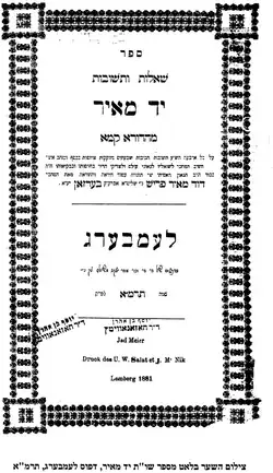 The "Yad Meir" (translated "Hand of Meir") was published in Lemberg (now Lviv) in 1881, in the year before his passing. It contains 56 responsa (Nos. 1 to 57, with No. 32 missing), most of them addressed to well-known talmudic scholars of his time, including his sons. The numerical value of the Hebrew word "yad" is 14, the same as the value of "David", the author's first name. "Yad" is also the acronym of "Yad David", while Meir is the author's middle name.[22]