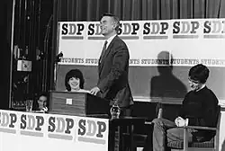 Early in 1981, Owen and three other senior moderate Labour politicians – Roy Jenkins, Bill Rodgers and Shirley Williams – announced their intention to break away from the Labour Party to form a "Council for Social Democracy". The announcement became known as the Limehouse Declaration and the four as the "Gang of Four". The council they formed became the Social Democratic Party (SDP), with a collective leadership.[18] Although Owen was one of the founding members of the party, he was not always enthusiastic about creating a schism on the centre-left, saying to the Glasgow Herald in January 1981 that he felt "haunted by the possibility that, if the Labour Party splits, the centre left will never again form the Government in Britain".[19]