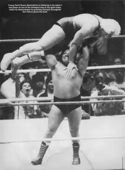 Sammartino joined the World Wrestling Federation (WWF) in September 1984, with his father as his manager.[2] He received a big push while teaming with his father, he was also pushed in singles matches. He appeared at the inaugural WrestleMania event in Madison Square Garden in New York City, New York on March 31, 1985. Accompanied by Bruno, Sammartino wrestled Brutus Beefcake in the fourth match of the night. The match ended in a double disqualification after Sammartino was thrown out of the ring by Beefcake and slammed by Beefcake's manager Johnny Valiant, prompting Bruno Sammartino to assault Valiant.[2] This led to a series of tag team matches that brought Bruno out of retirement in an effort to get David's career advanced.[2] When Bruno was involved, David was often in the main event or in a high-profile match; when Bruno wasn't involved David would be wrestling preliminary matches.[2]