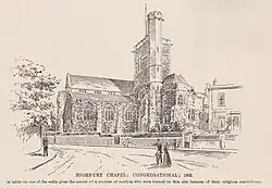 During Thomas' absence from Bristol, Highbury Chapel in Cotham was built. He was asked to become its first minister in July 1844.[7] He served there for the next thirty years, during which time the chapel grew in size and developed a strong reputation.[8] At the same time he helped establish additional congregational chapels in Cotham and Redland to serve the rapidly growing population. His congregation established a chapel and school near Durdham Down in autumn 1849 and a mission chapel on Salmon Street, Kingsdown in 1860.[9] Thomas also helped establish Redland Park Congregational Church in 1861.[10]