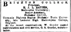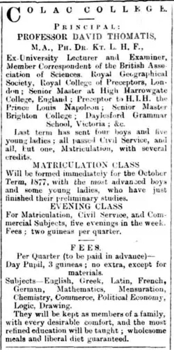 According to shipping notices he arrived anew in Melbourne in December 1875. By the end of the month he was advertised as the senior assistant to the principal of "Brighton College". His credentials given there were "Diploma Regius Professor Turin University" and "late Lecturer Harrowgate College, England".[5] It was a short-lived appointment, because by July 1876 the Ballarat Grammar School advertised that it had "secured the services of Prof. David Thomatis, a first class Mathematical and Classical Scholar". It was also said that he was prepared to receive a limited number of boarders. By March 1877 the "Colac College" advertised itself with Principal Professor David Thomatis, M.A., Ph. Dr. Kt. L H.F. In August 1878 it was noted that the council of Colac dealt with a complaint of Thomatis about the footpath in front of the college.