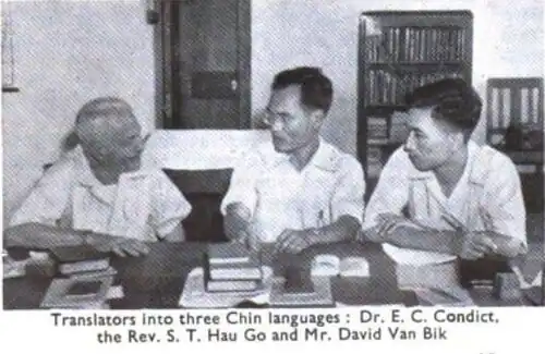 In the 1953 record of the British and Foreign Bible Society, a picture portrayed David Van Bik as one of the Bible translators in Chin languages.[39] However, according to Rev Johnson, David Van Bik and he began the work of Lai Bible translation in Hakha from 1955. They performed the translation work in their spare times. In 1957, they completed the translation of the Book of Genesis and Book of Exodus, which were published in the same year.[40] From 1961, David in Falam and Johnson in Hakha resumed the translation work. They had a six-week work rotation for 24 months: David coming to Hakha for two weeks and Johnson going to Falam for two weeks. Then, for the fifth and sixth weeks, they worked individually.[41]