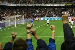Villa attracted interest from many Asturian teams, but one of the province's bigger teams, Real Oviedo, declared that he was too short and that they did not believe he had sufficient potential.[21][22] He subsequently got his professional breakthrough at his local club Sporting de Gijón, following in the footsteps of his childhood idol Quini.[18] Starting out at the team's youth ranks, he made his first-team debut in the 2000–01 season. After scoring 25 goals in two seasons, he became a first team regular.[22] Pepe Acebal, Sporting's manager at the time, said that Villa initially lacked the stamina to have a real impact and had to be given his chance bit by bit and that Villa's capacity for work was "unrivalled".[21]